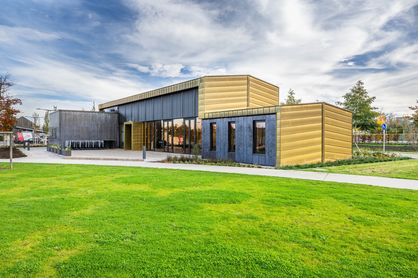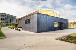 Die Brasserie beim Haupteingang des Parks am Ban de Gasperich dient als Übergang von der städtischen Umgebung zum Park. Der Bau umfasst eine lange Fassade parallel zum Boulevard de Kockelscheuer sowie eine oberirdische Ebene samt großem Restaurantbereich mit doppelter Höhe. Die Brasserie wird diesen neuen urbanen Raum mit Gebäuden von erheblich größerem Maßstab auf diskrete Weise bereichern.