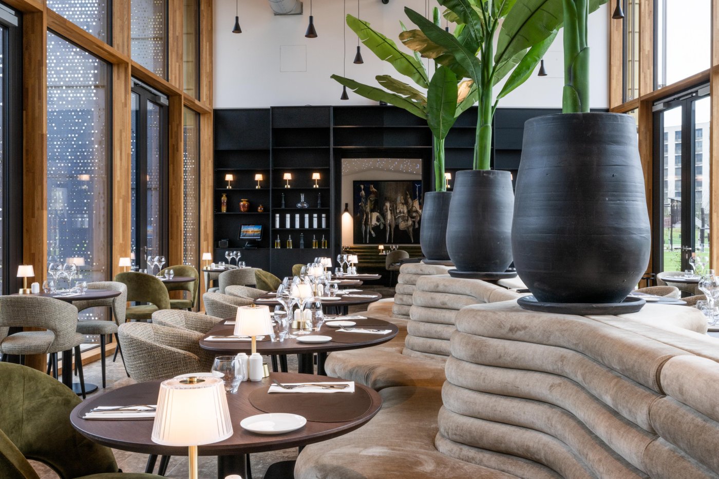 Sie bietet im Innenraum 80 Sitzplätze und ist in zwei Bereiche unterteilt: zum einen der große Saal mit 50 Sitzplätzen und einer Bar mit 9 Thekenplätzen, zum anderen die Alkoven, ein gemütlicher Bereich mit 30 Sitzplätzen. Im Außenbereich bieten zwei Terassen – auf der Parkseite sowie aufseiten des Boulevard de Kockelscheuer – insgesamt 100 Sitzplätze. Das Restaurant hat eine Kapazität von maximal 200 Mahlzeiten pro Tag (Bedienung am Tisch). Der Restaurantsaal, die Alkoven, die Küche, die Liefer-, Reinigungs- und Vorbereitungsbereiche, die Tagesvorräte sowie das Büro werden im Erdgeschoss untergebracht.
