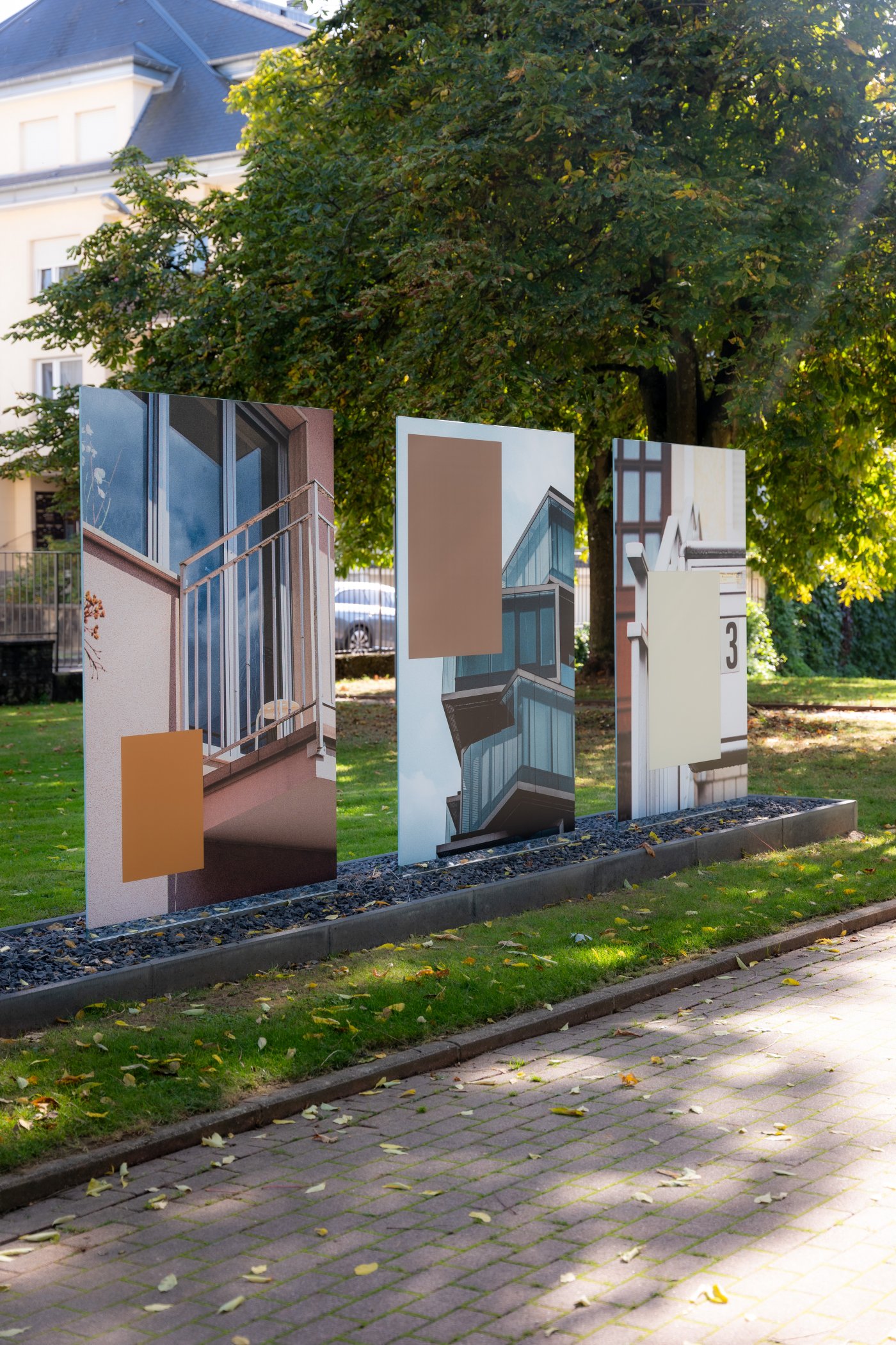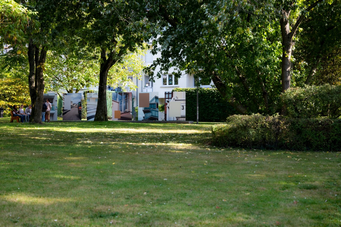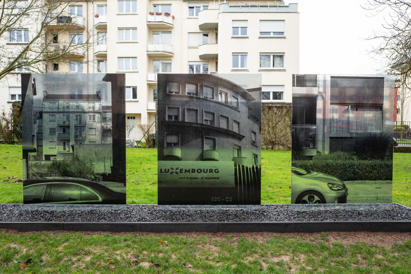 The "URBAN DIALOG" project, by Luxembourg artist and photographer Jessica Theis, was created to be put on display in Merl Park. As the title indicates, the exhibit directs the observer's attention to the dialog between its subjects and their environment. Printed on glossy and semi-transparent panels, the images elicit a conversation between the depicted architectural elements and the surrounding natural environment, and even incorporate the visitor or passer-by, whose reflection can be seen in the artwork.
