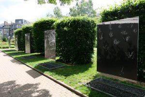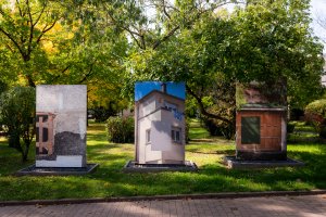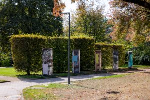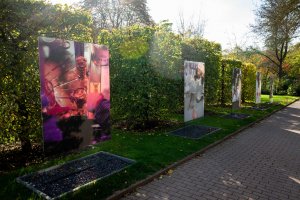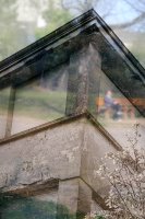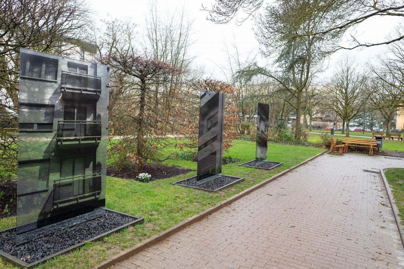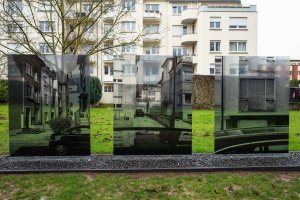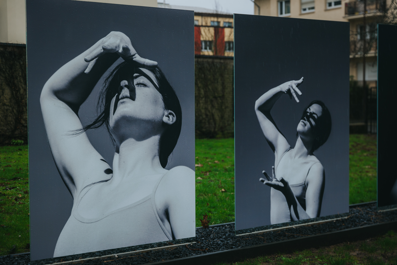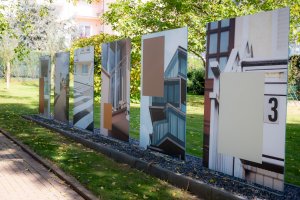 The "URBAN DIALOG" project, by Luxembourg artist and photographer Jessica Theis, was created to be put on display in Merl Park. As the title indicates, the exhibit directs the observer's attention to the dialog between its subjects and their environment. Printed on glossy and semi-transparent panels, the images elicit a conversation between the depicted architectural elements and the surrounding natural environment, and even incorporate the visitor or passer-by, whose reflection can be seen in the artwork.
