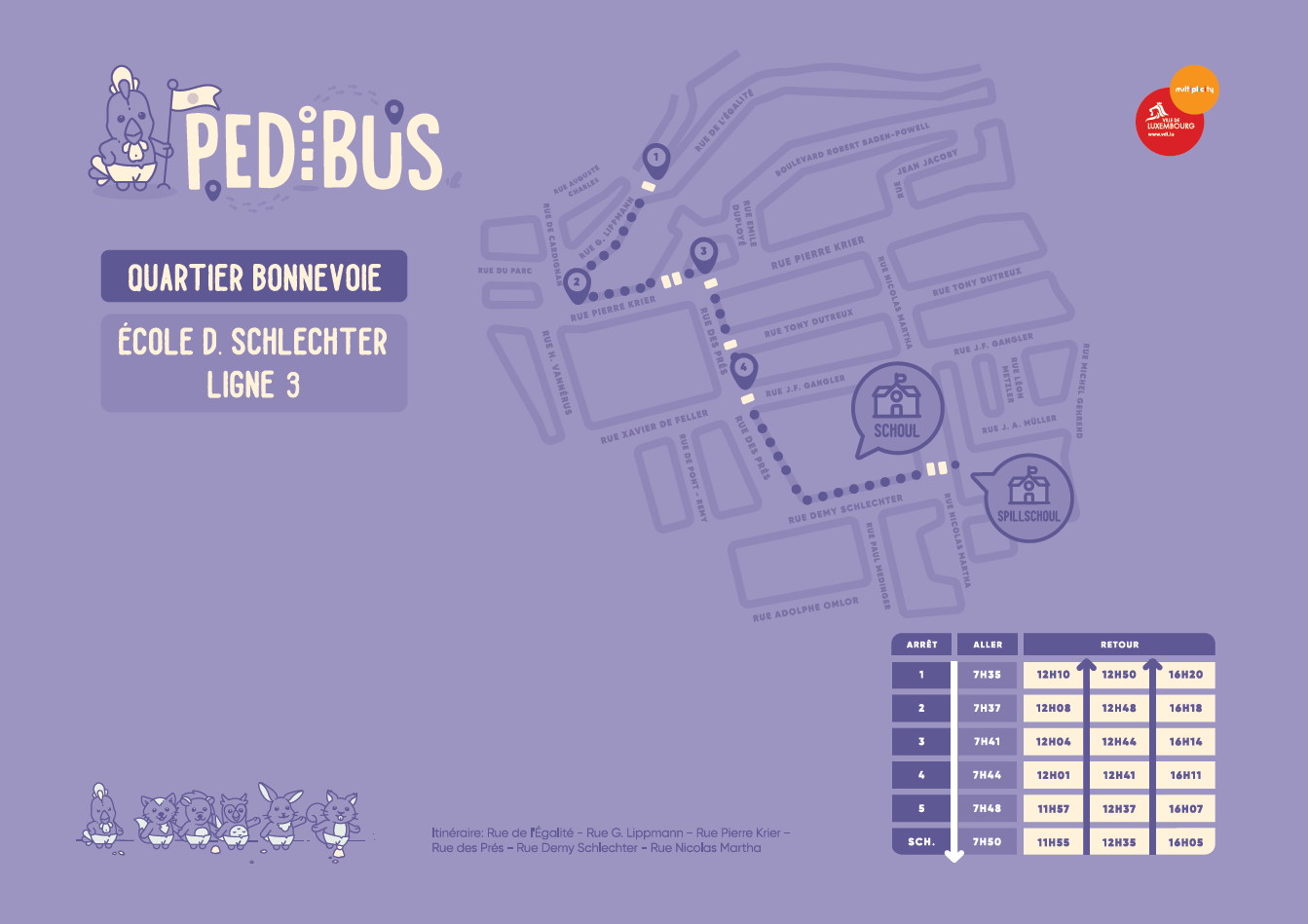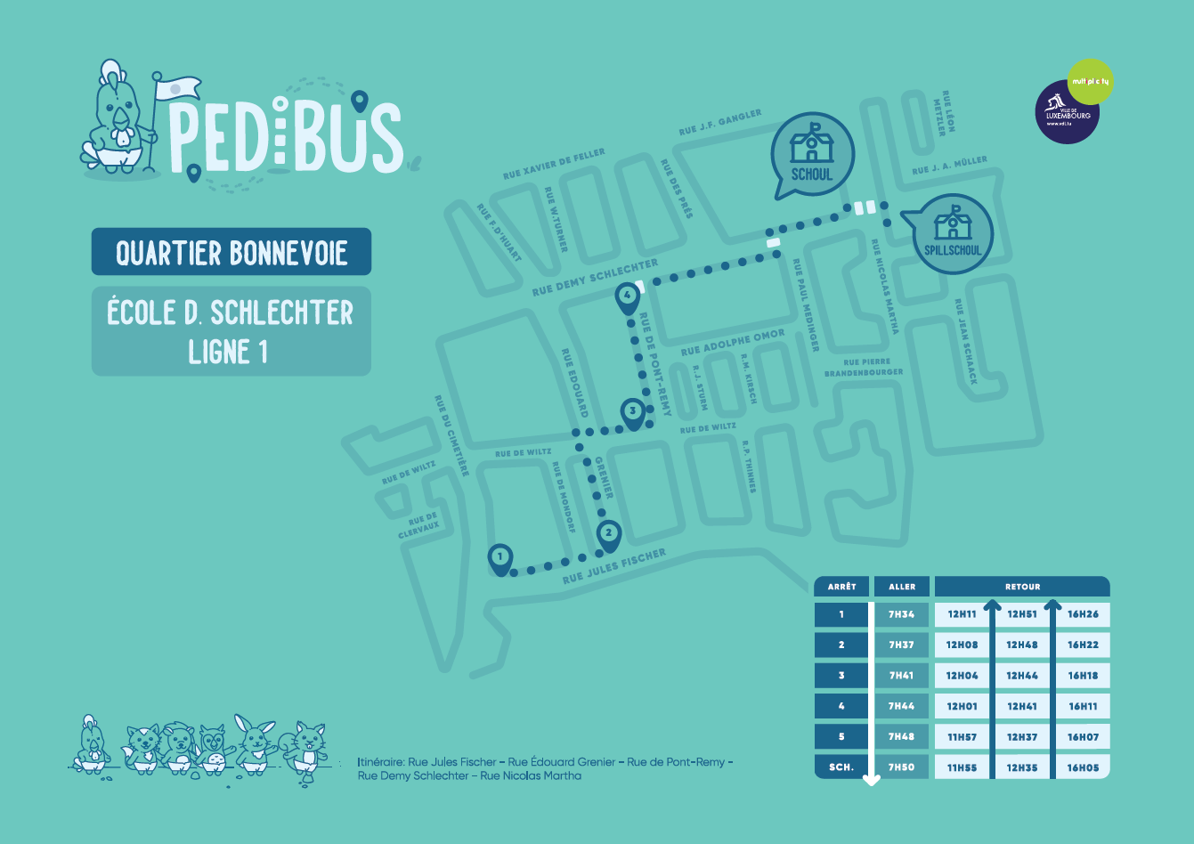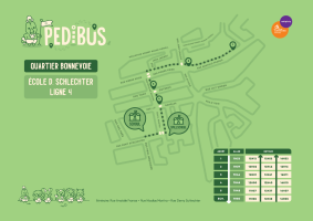 Le Pedibus accompagne les enfants à pied vers l’école depuis différents points de ralliement, clairement indiqués par des panneaux. Les enfants y sont pris en charge en toute sécurité.