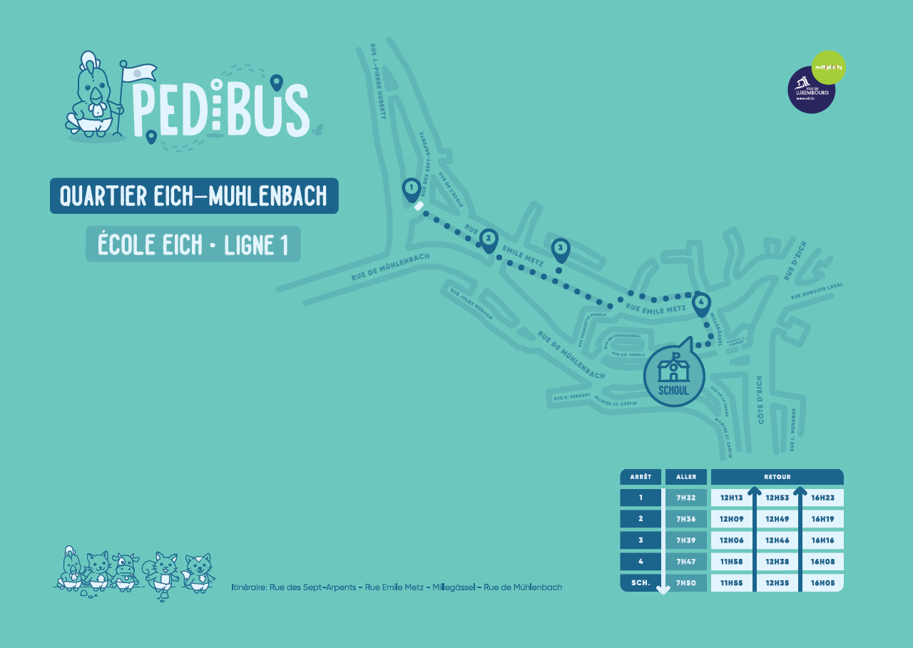 Le Pedibus accompagne les enfants à pied vers l’école depuis différents points de ralliement, clairement indiqués par des panneaux. Les enfants y sont pris en charge en toute sécurité.