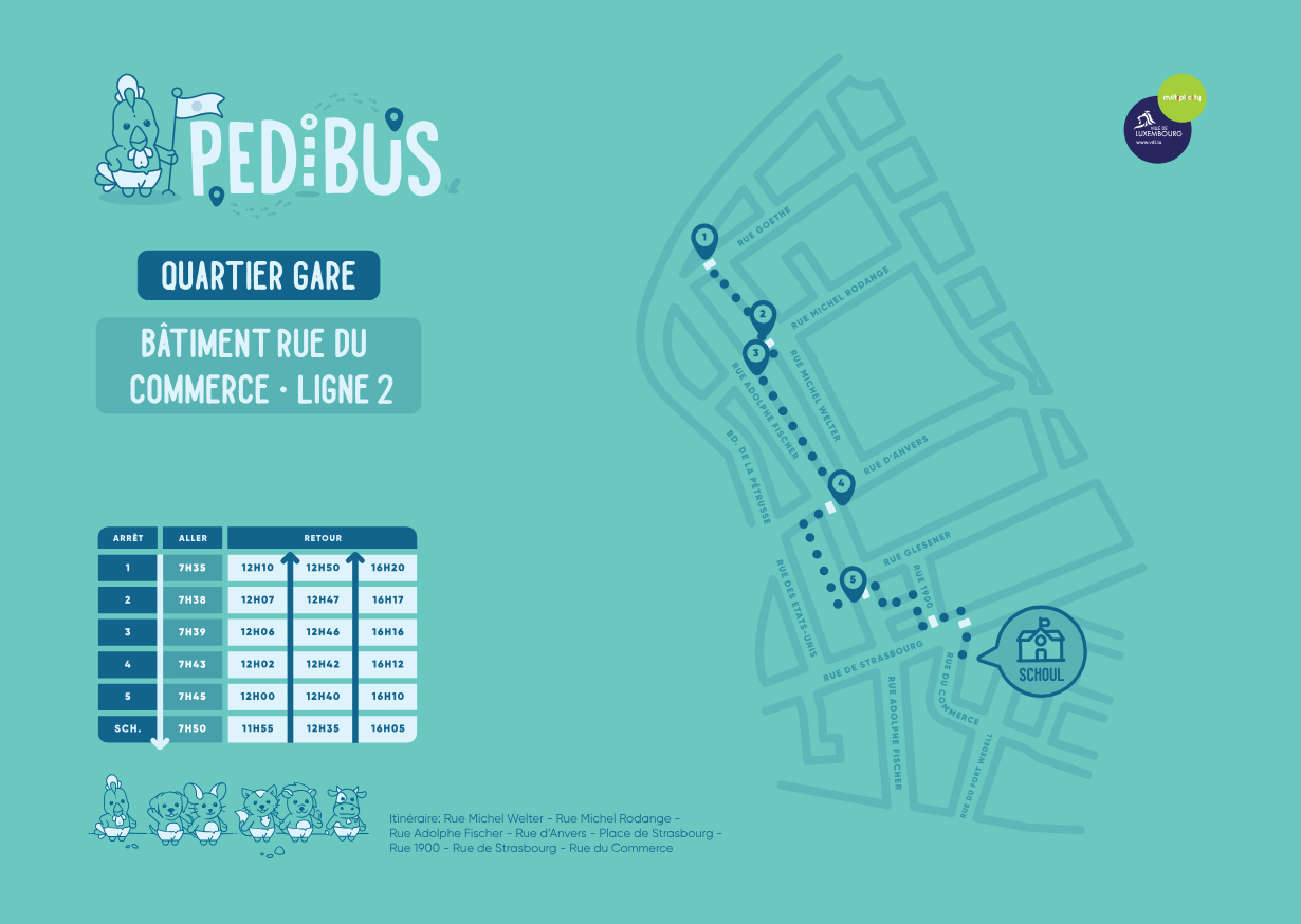 Le Pedibus accompagne les enfants à pied vers l’école depuis différents points de ralliement, clairement indiqués par des panneaux. Les enfants y sont pris en charge en toute sécurité.